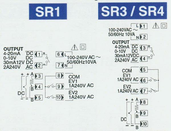 SR1/SR3,SR4 PID调节器, 具有双四位显示, 自整定专家PID参数,带调节输出限制,手/自动切换,2组独立的上下限报警,键锁定等功能,前面板防护等级IP66。